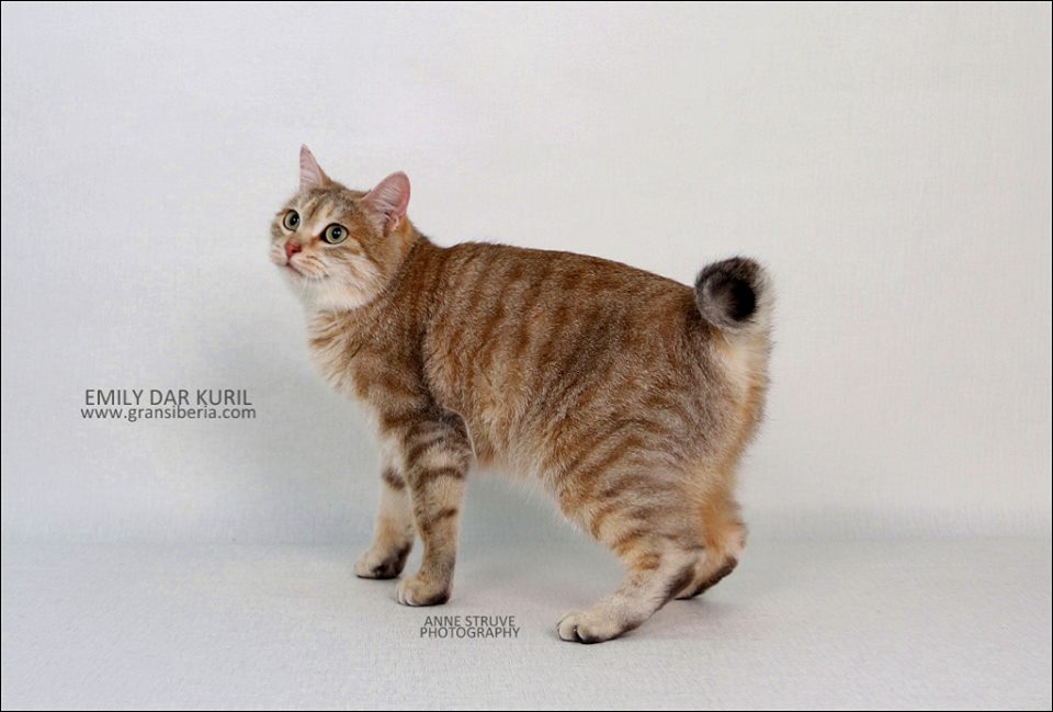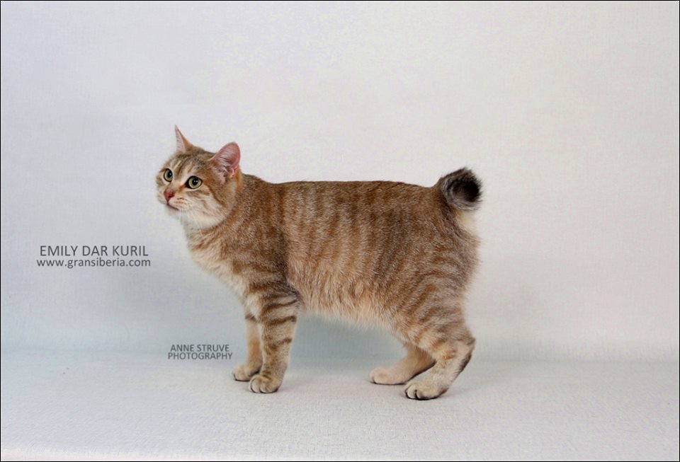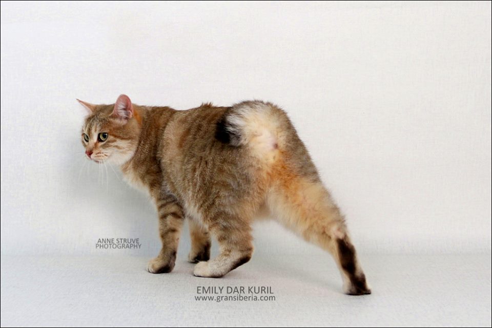 Cuerpo. Es un gato compacto, musculoso y con una estructura ósea sólida. Hay una gran diferencia de tamaño dependiendo de si son salvajes o no. Mientras que los machos salvajes pesan entre 3,5 y 4 kilos, los domésticos pueden llegar hasta los 6 kilos. En el caso de las hembras salvajes no llegan a pesar los 3 kilos, mientras que en las hembras domesticas el peso varía hasta los 4 kilos. Cuando está erguido, la espalda muestra una sutil curva desde los hombros hasta la cola enrollada. La cola puede ser rígida flexible, pero siempre enrollada o con muchas torceduras en diferentes angulos. Es imposible encontrar dos colas exactamente iguales.